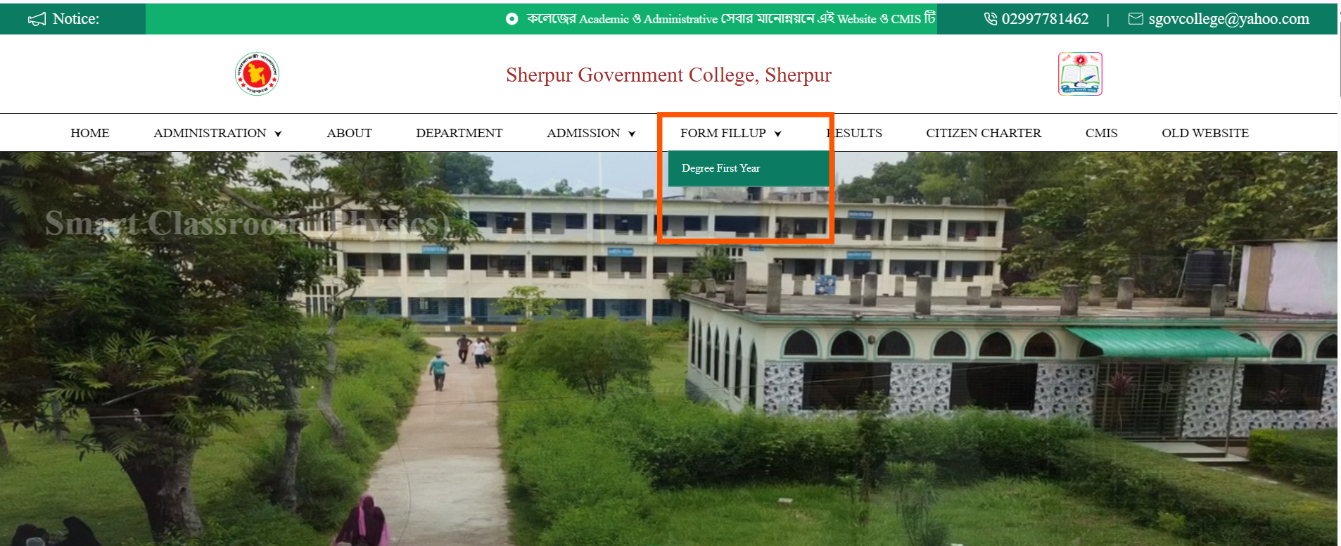 ৩. Online Admission Form পূরনের লক্ষ্যে কলেজের Web site (https://sherpurgovtcollege.edu.bd/) এর Menu Bar এ বিদ্যমান Form Fillup>Degree First Year Button এ Click করতে হবে।