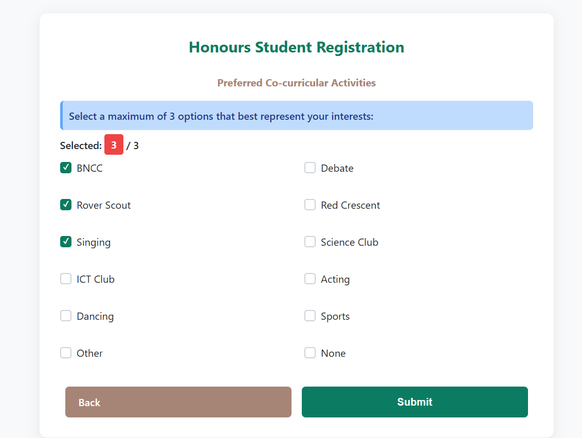 সর্বোচ্চ ৩ টি সহপাঠক্রম বিষয়ের নাম নির্বাচন করা যাবে।