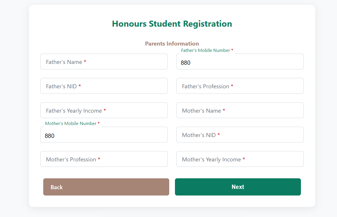 শিক্ষার্থীর পিতা ও মাতার নাম, পিতা ও মাতার মোবাইল নম্বর, পিতা ও মাতার NID নাম্বার (10 বা 17 ডিজিট এর), পিতা ও মাতার পেশা এবং পিতা ও মাতার বাৎসরিক আয়।
