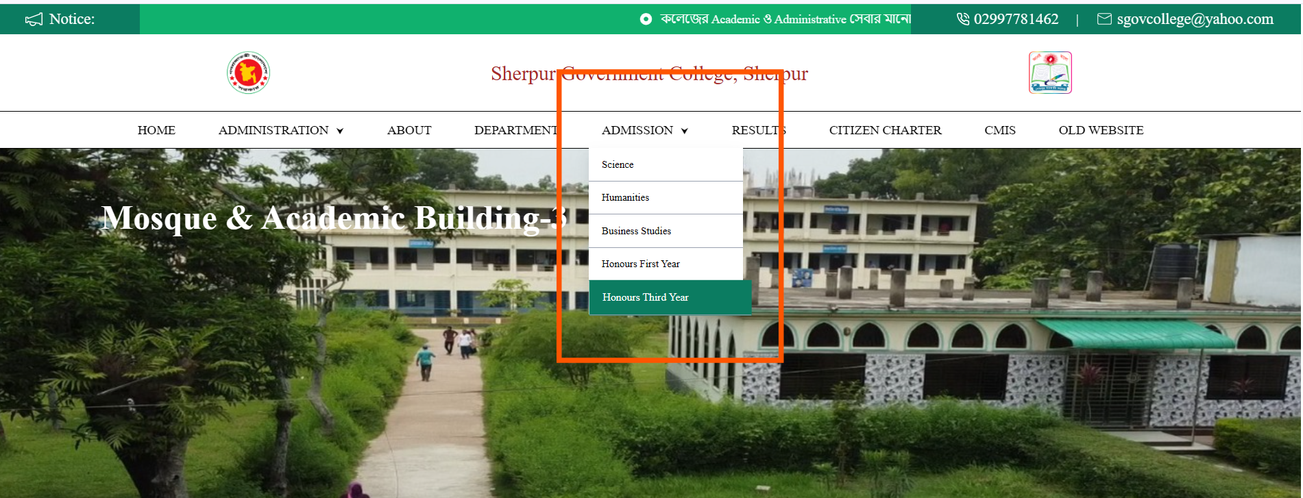 ৩. Online Admission Form পূরনের লক্ষ্যে কলেজের Web site (https://sherpurgovtcollege.edu.bd/) এর Menu Bar এ বিদ্যমান Admission>Honours Third Year Button এ Click করতে হবে।