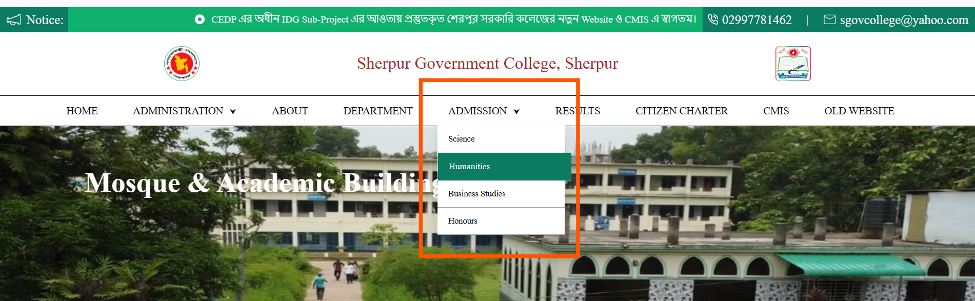 ৩. Online Admission Form পূরনের লক্ষ্যে কলেজের Web site (https://sherpurgovtcollege.edu.bd/) এর Menu Bar এ বিদ্যমান Admission>Science, Admission>Humanities অথবা Admission>Business Studies Button এ Click করতে হবে।
