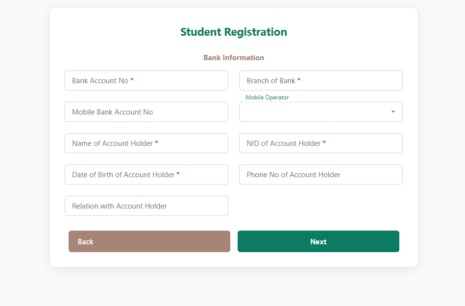 শিক্ষার্থীর পিতা/মাতা/অভিভাবকের বৈধ্য ব্যাংক একাউন্ট বা মোবাইল ব্যাংকিং একাউন্ট নাম্বার, ব্যাংকের নাম ও শাখার নাম বা মোবাইল ব্যাংকিং অপারেটরের নাম, একাউন্টধারীর নাম, একাউন্টধারীর জন্ম তারিখ, একাউন্টধারীর মোবাইল নম্বর, একাউন্টধারীর NID নাম্বার (10 বা 17 ডিজিট এর) ও একাউন্টধারীর সাথে শিক্ষার্থীর সম্পর্ক।